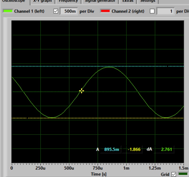 signal generator tab. This allows you to select the type of signal generated, frequency and amplitude for each channel. It also allows you to set up frequency sweeps that are very handy for checking frequency response of amplifiers. This can be brought out as a separate window to make it easier to use.